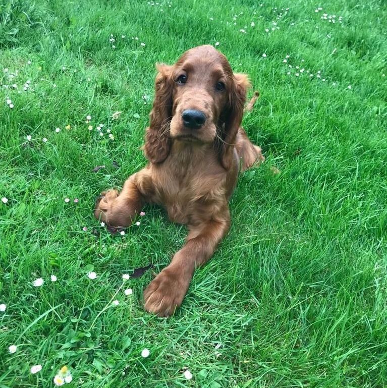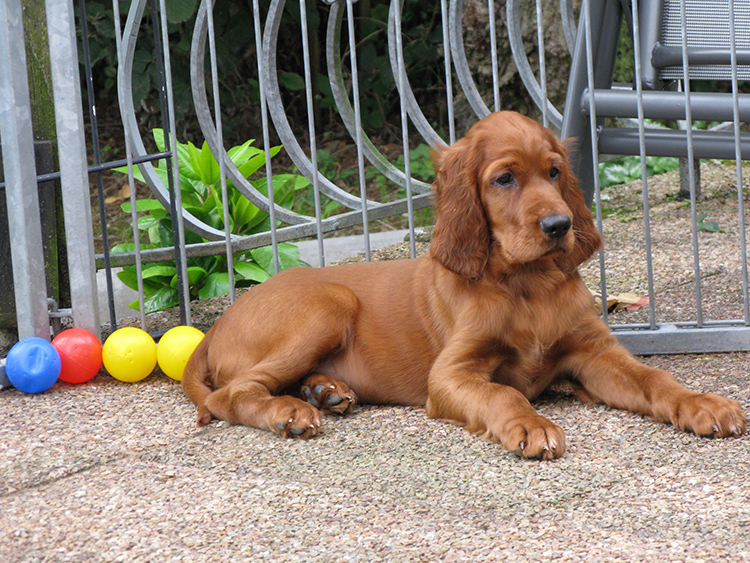 Bereits als 12jähriger Teenager begann für mich das Interesse für diese wunderschöne Rasse. Ich kam täglich auf meinem Weg zur Schule an einer Metzgerei vorbei, in deren Riesengarten mich eine Irish Setterhündin namens Senta mit leuchtenden Augen begrüßte. Als besonderes Ritual hatten wir für uns beide einen gemeinsamen Wettlauf am Gartenzaun gefunden. Mir tat es damals so leid, dass sie aufgrund des arbeitsintensiven Berufes von Herrchen so wenig Auslauf hatte. So fragte ich nach einiger Zeit vorsichtig nach, ob ich Senta vielleicht nach der Schule einmal ausführen dürfte. So geschah es, dass ich in den folgenden zwei Jahren nur diese liebenswerte Setterhündin im Kopf hatte und mit ihr sehr viel Freizeit verbringen durfte.. Wir hatten eine schöne Zeit miteinander und als eines Tages Senta mit knapp 12 Jahren ganz plötzlich verstarb, stand für mich fest: irgendwann werde ich meinen eigenen Setter im Haus haben, irgendwann…