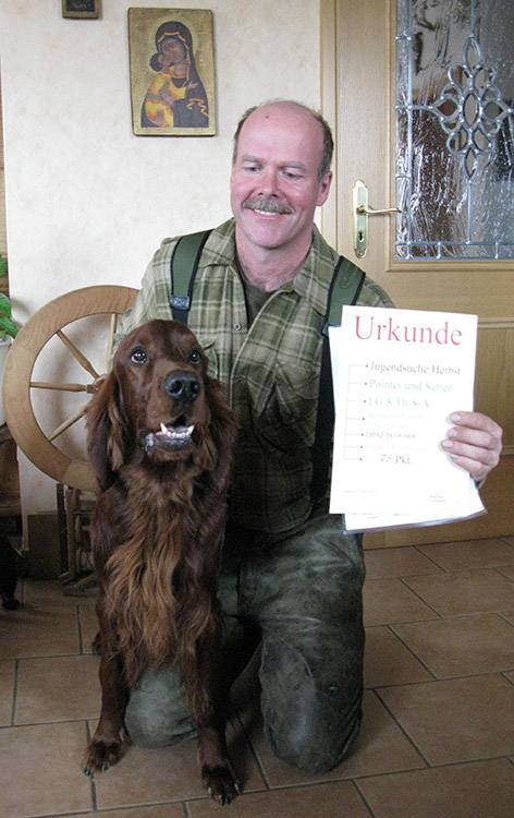 An dieser Stelle noch einmal ein herzliches Dankeschön an Sie, lieber Herr Wicker, für Ihre Geduld und die vielen Ratschläge, die ich zum Thema Irish Setter Zucht von Ihnen erhalten habe. Sie waren mit Ihrer Überzeugungskraft und Ihrem Feingefühl auch für die kleineren Probleme im Alltag unschlagbar und ich werde Ihnen ewig dankbar dafür sein.